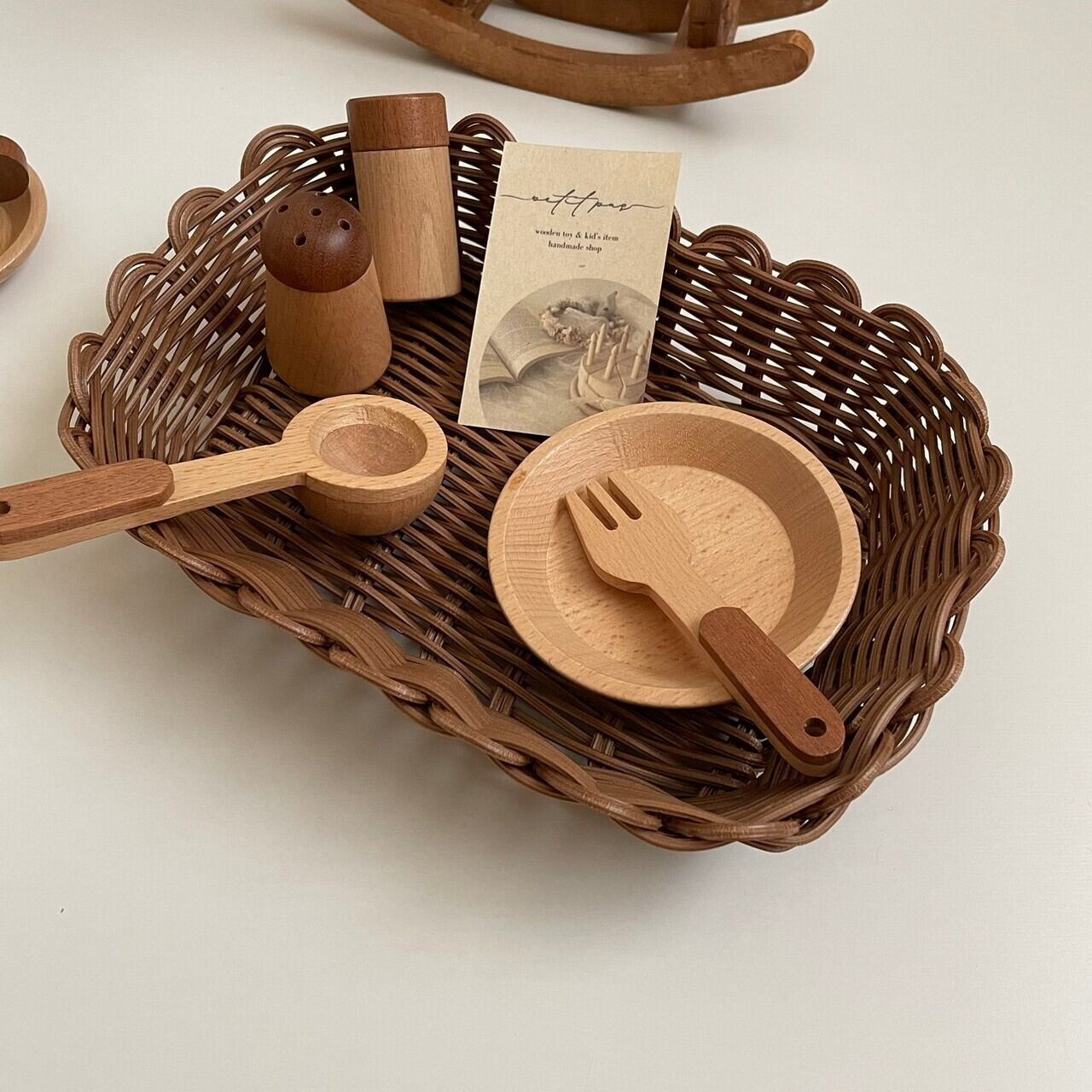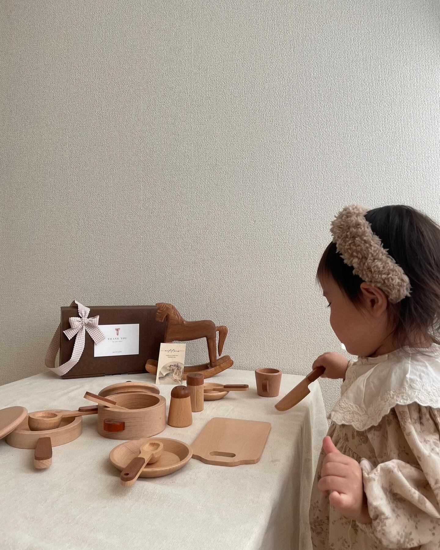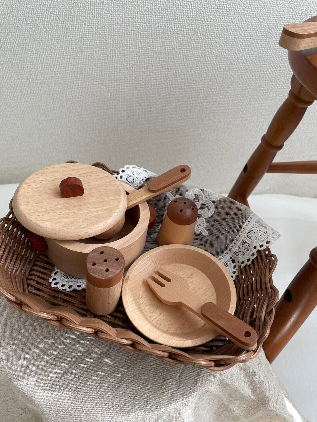 おままごとに欠かせないアイテムがセットになった木のおもちゃです。
